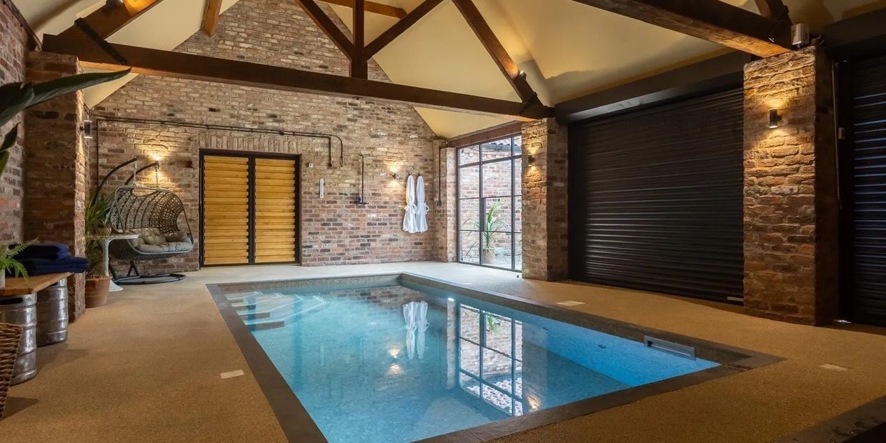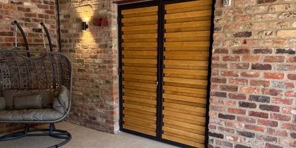 This beautiful pool room barn conversion was finished perfectly with architectural glazing opening. Accompanied by bespoke steel service room doors with oak louvred slats. Finished in RAL 8019 Powder-coating and 6mm one-way privacy glazing. The perfect combination of luxury aesthetics and functionality.